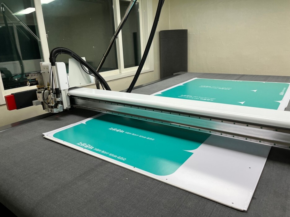 이제 커팅이 시작되었습니다. 평판커팅기가 홍보용 POP를 만들기 위한 최적의 커팅라인을 찾아