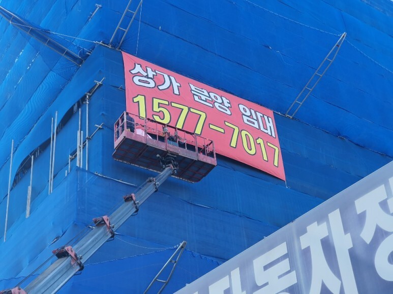 대형현수막을 시공하는 장면입니다