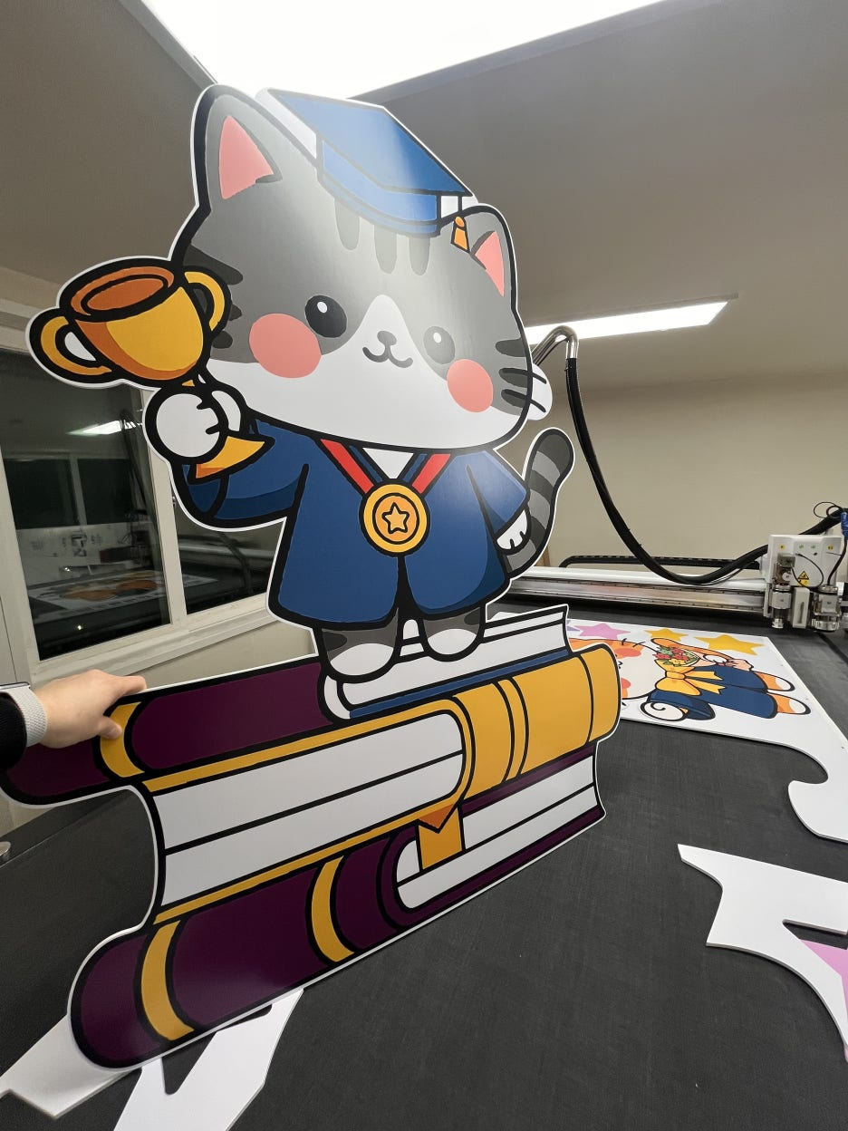 이번 작업은 초등학교 졸업식 기념으로 만든 건데, 디자인 자체가 귀엽고 컬러가 쨍해서(보라/노랑/핑크 조합 + 졸업 고양이 캐릭터)
