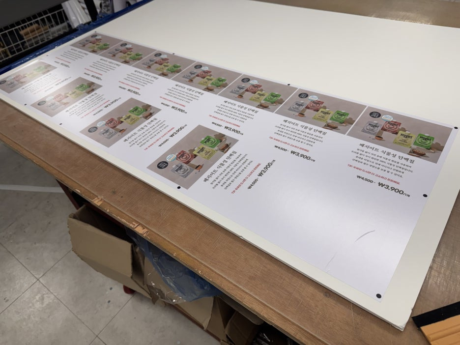 제품 안내/가격표/프로모션 문구가 들어간 보드들을 여러 장 한 번에 출력하고, 바로 평판 커팅기로 원하는 모양대로 컷팅해서 마감했습니다. 게다가 일정이 급해서(긴급건) 스케줄에 맞춰 바로 제작한 케이스라, 폼보드 작업이 어떤 순서로 돌아가는지 보여주기 좋습니다.