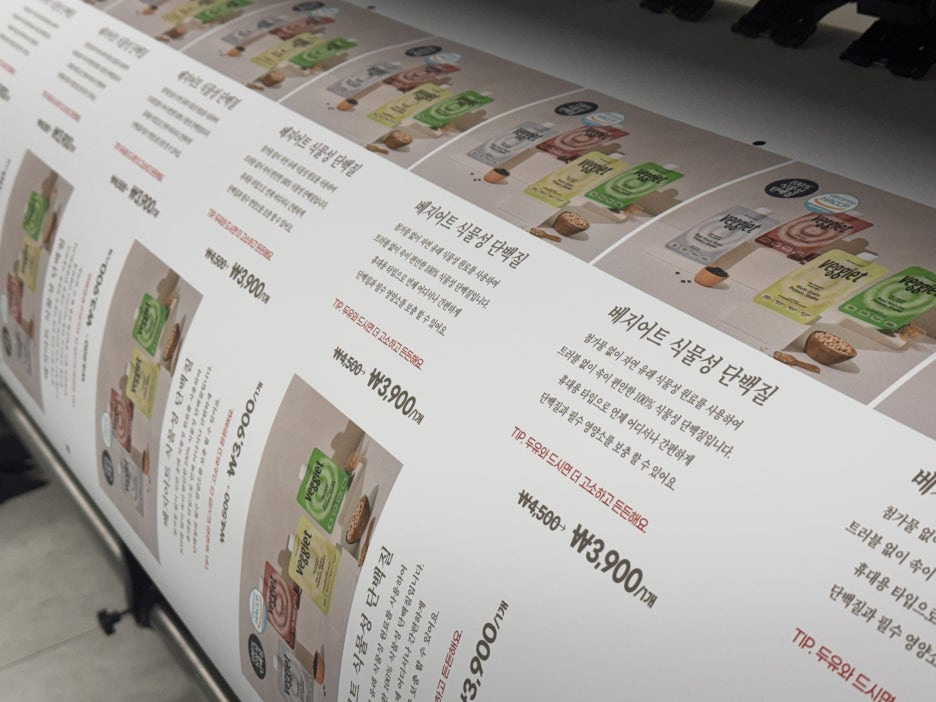 배경이 연한 색(베이지·그레이)일수록 밴딩(줄)이나 농도차가 더 잘 보여요. 사진처럼 제품 컷이 들어간 홍보용 패널/POP은 배경 톤이 흔들리면 바로 “인쇄 티”가 납니다.